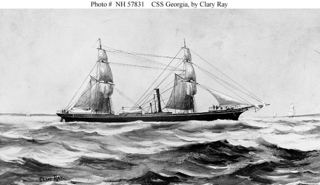 CSS Georgia, a 1150-ton iron screw steam cruiser, was built Dumbarton, Scotland, in 1862 as the merchant ship Japan. Purchased secretly by the Confederate Government in March 1863, she was converted to a warship at sea in April. Placed in formal commission under the command of Lieutenant William L. Maury, CSN, Georgia cruised in the North and South Atlantic, capturing 9 United States' merchant vessels. She put into Cherbourg, France, in late October 1863 with her iron hull badly fouled by marine growth and was decommissioned as being unsuited for further use as a warship. Plans to transfer her armament to the Confederate cruiser Rappahannock fell through, and Georgia was sold to commercial interests.