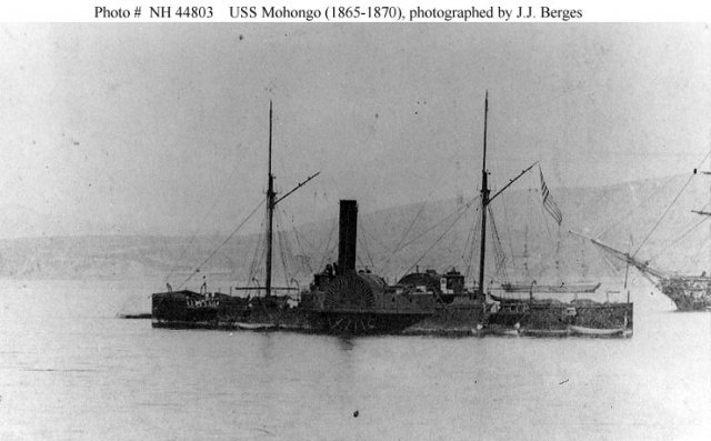 USS Mohongo, name ship of a class of seven 1370-ton iron "double-ender" side-wheel steam gunboats, was built at Jersey City, New Jersey. Commissioned in May 1865, she departed late in that month on a cruise around South America to join the Pacific Squadron. During May 1866, she was stationed at Callao, Peru, protecting U.S. interests during the war between Spain and Peru. In August, she proceeded north to become part of the North Pacific Squadron.