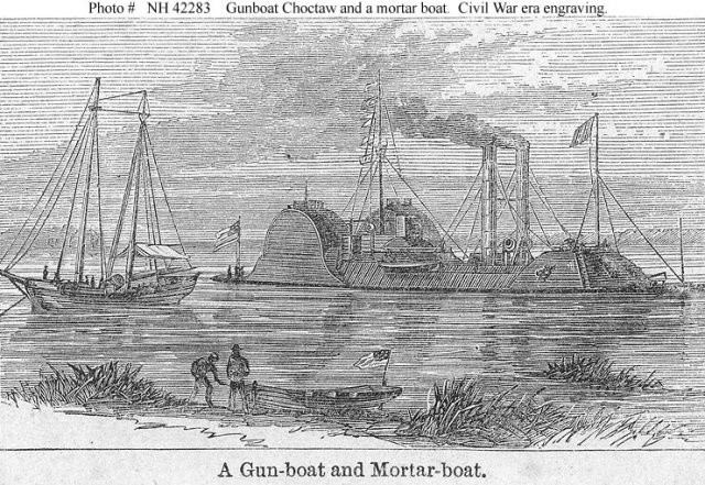 Line engraving from a 19th Century publication. It depicts the river ironclad USS Choctaw (1863-1866), at right, with a mortar schooner.
