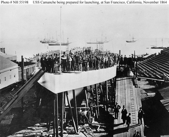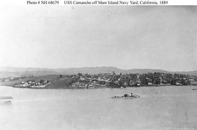 USS Camanche, a 1335-ton Passaic class monitor, was prefabricated at Jersey City, New Jersey. Her materials were then sent around Cape Horn in the sailing ship Aquila to San Francisco, California, where Aquila sank in November 1863. The monitor's parts were salvaged and assembled at San Francisco and she went into commission in May 1865, just after the end of the Civil War. For more than a year, until the arrival of the larger twin-turret monitor Monadnock, Camanche was the Navy's only ironclad warship on the Pacific coast, and she was one of but two stationed there for nearly two and a half decades.