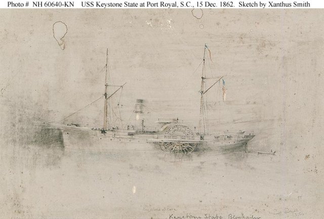 USS Keystone State , a 1364-ton side wheel steamship, was built at Philadelphia, Pennsylvania, in 1853 as the civilian steamer Keystone State. Chartered by the Navy in April 1861, as the Civil War began, she captured one suspected blockade runner in May. Purchased after the charter period ended, she was placed in commission a month later. For the rest of that year, Keystone State cruised in the Atlantic and Caribbean areas.